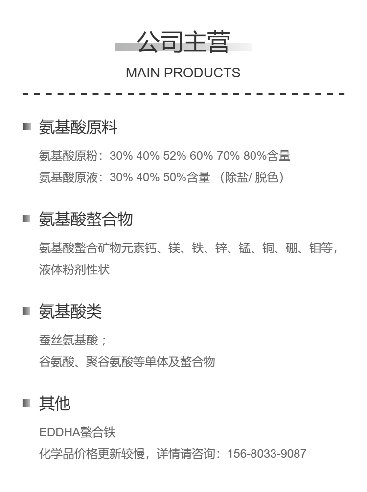 氨基酸螯合物:氨基酸螯合款矿物元素铁、锌、锰、铜、硼、钼、镁、钙等,液体粉剂性状