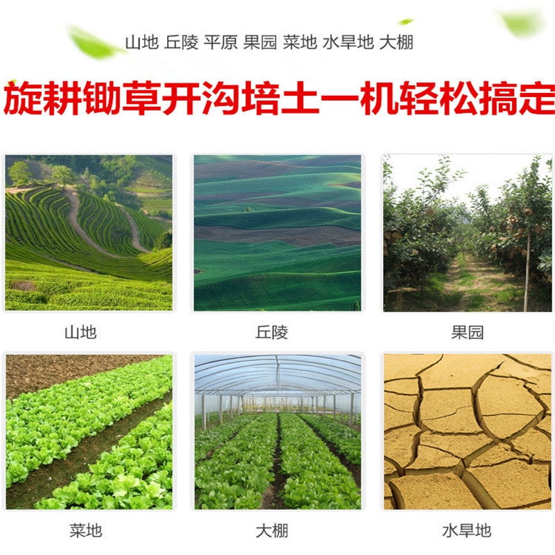 适用各种山地,丘陵、平原、旱田、水田、大棚、果园、及狭窄地作业,省心。硬土、粘土、黑土地,山地,软土均可使用,放心。