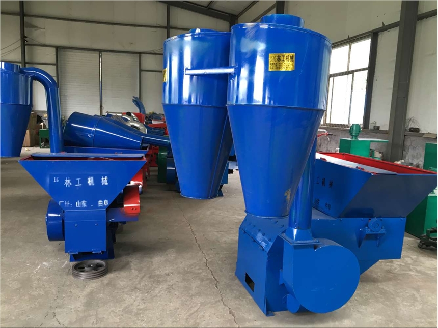 在粉碎秸蔓类时无须预加工也不需要机手在进料口用手喂料,只须用棍杈挑入破碎仓即可,使用时在距破碎仓一米处直接将花生秧,地瓜秧,麦秸,整捆玉米秸秆等投入破碎仓,通过秸杆的下沉力自动进料,经粗加工后自动进入粉碎室进行二次粉碎。草粉由风机提入沙克龙集粉器后装入袋子。克服了以往粉碎机喂料困难,危险,效率低下,草粉装袋费