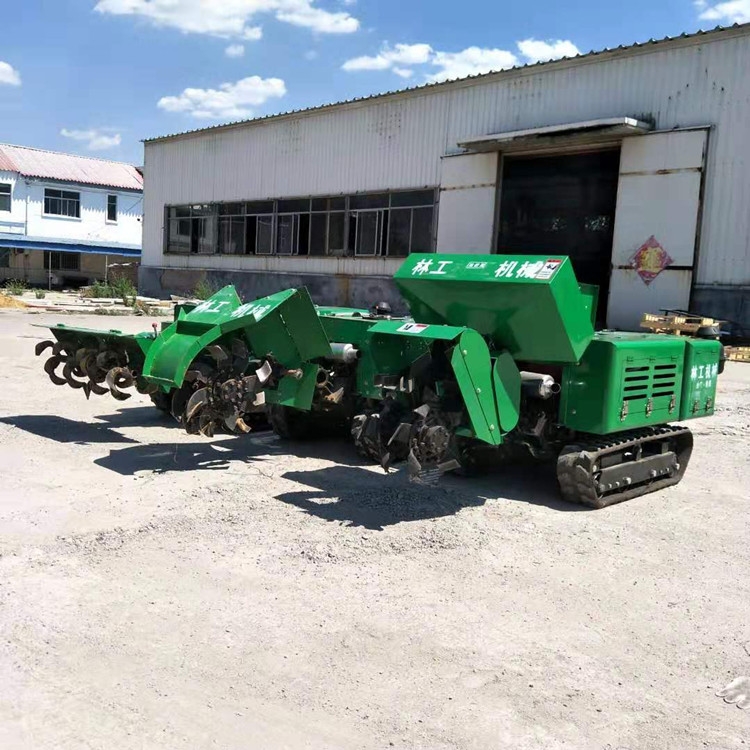 多功能 履带式开沟施肥机安装上不同的配件可以进行单独旋耕、回填、单独开沟、施肥、也可混合搭配使用。产品结实耐用,性能优越,操作方便.耐用:机身加厚,密,履带式行走,可进行原地转向。刀具都是加厚75号猛钢锻造,非常耐磨耐用,工作效率高.