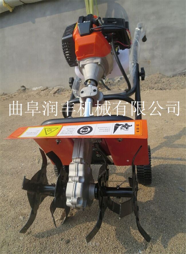 旋耕机主要用于水稻田和蔬菜地,也用于果园中耕。重型横轴式旋耕机,耕深可达20~25厘米,多用于开垦灌木地、沼泽地和草荒地的耕作。工作部件(见图)包括旋耕刀辊和按多头螺线均匀配置的若干把切土刀片,由拖拉机动力输出轴通过传动装置驱动,常用转速为190~280转/分。刀辊的旋转方向通常与拖拉机轮子转动的方向一致!果树松土除草机 家用松土除草机 松土锄草机
