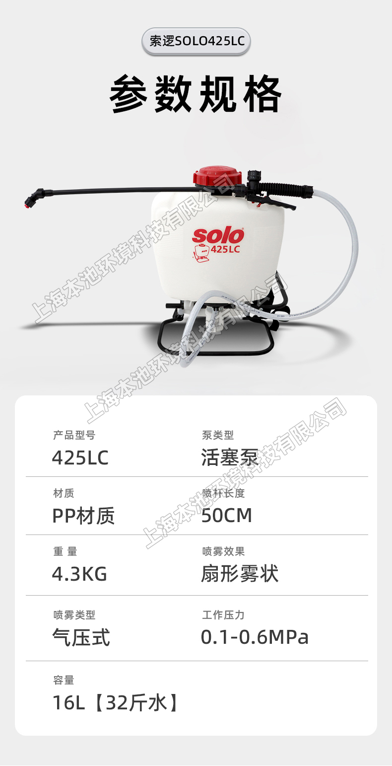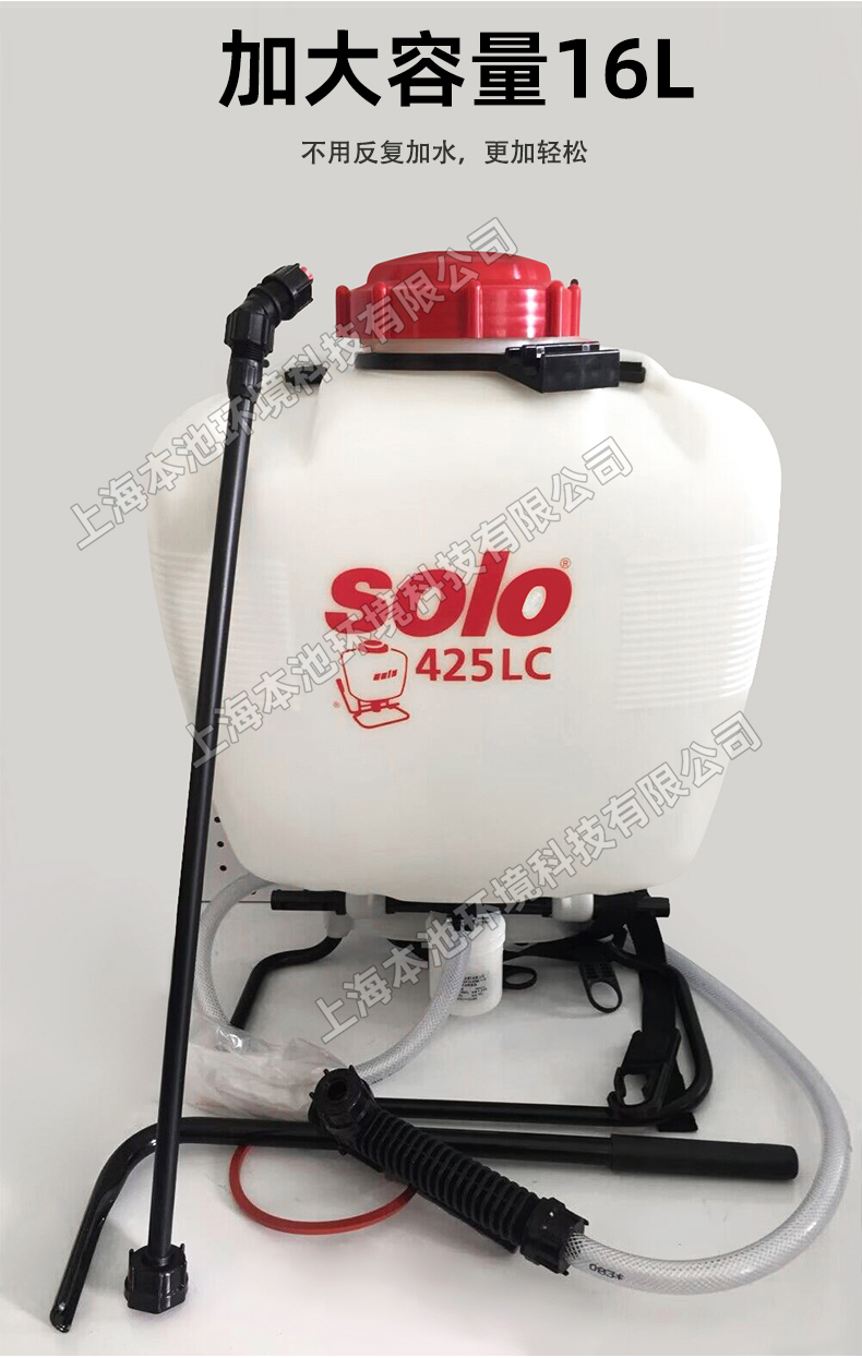 SOLO索逻425LC背负式手动杀虫消毒喷雾器加大容量16L,雾化细腻,直流强劲,加宽背带,加厚桶身,无需充电,适用多种场景的消毒防疫杀虫等,比如公园、养殖场、园艺果园、餐厅、办公场所等,采用扇形喷嘴,喷射覆盖面积广,可锁定开关,工作起来轻松顺手,喷洒除臭剂消除室内的异味;喷洒水用于室内空气加湿、降尘等。外形新颖,操作简单,携带方便,雾化性能好。设计轻巧,多用途,室内室外都能用。用起来很简单,随时随地,方便快捷,轻松工作,省时省力。