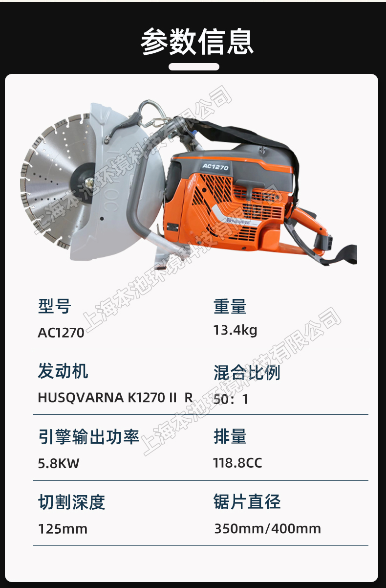 Husqvarna富世华/胡斯华纳AC1270切割锯,手持式消破拆无齿锯,5.8KW大功率,锯片直径400mm,钢板切割锯。适用于消防破拆,铁轨钢轨切割,混凝土切割,石材墙壁切割等多种场合。