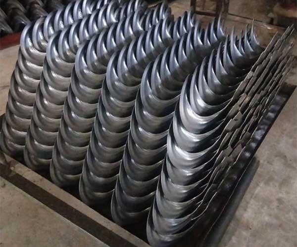 320mm碳钢螺旋叶片连续耐磨无轴螺旋叶片的特点是:结构简单、横截面尺寸小、密封性好、工作可靠、制造成本低,便于中间装料和卸料,输送方向可逆向,也可同时向相反两个方向输送。输送过程中还可对物料进行搅拌、混合、加热和冷却等作业。通过装卸闸门可调节物料流量。但不宜输送易变质的、粘性大的、易结块的及大块的物料。输送过程中物料易破碎,螺旋及料槽易磨损。单位功率较大。使用中要保持料槽的密封性及螺旋与料槽间有适当的间隙。本公司生产的连续螺旋叶片具有表面光滑,无焊缝,硬度高,耐磨性好,输送流畅,减少物料破损率等优点。可制造外径90-800毫米,内径25-400毫米,板厚2-30毫米的连续螺旋叶片,叶片材质为各规格碳钢、不锈钢。旋转方向左右均可,长度不限等各种规格利用旋转的螺旋将被输送的物料沿固定的机壳内推移而进行输送工作,头部及尾部轴承移至壳体外,吊轴承采用滑动轴承设有防尘密封装置,轴瓦一般采用粉末冶金,输送水泥采用毛毡轴瓦,吊轴和螺旋轴采用滑块连接。