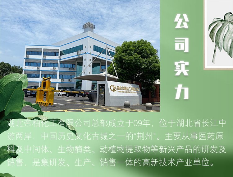 湖北帝柏化工有限公司总部成立于09年,位于湖北省长江中游两岸,中国历史文化古城之一的“荆州”。主要从事医药原料及中间体、生物酶类、动植物提取物等新兴产品的研发及销售,是集研发、生产、销售一体的高新技术产业单位。