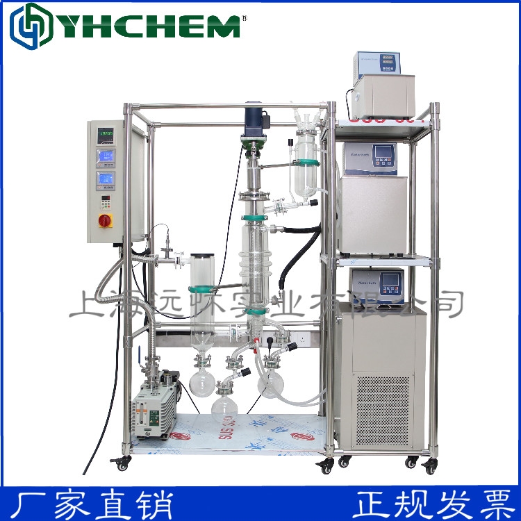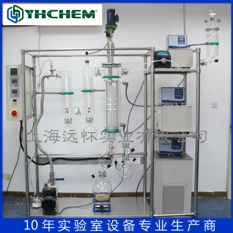 蒸馏过程是:物料从蒸发器的顶部加入,经转子上的料液分布器将其连续均匀地分布在加热面上,随即刮膜器将料液刮成一层极薄、呈湍流状的液膜,并以螺旋状向下推进。在此过程中,从加热面上逸出的轻分子,经过短的路线和几乎未经碰撞就到内置冷凝器上冷凝成液,并沿冷凝器管流下,通过位于蒸发器底部的出料管排出;残液即重分子在加热区下的圆形通道中收集,再通过侧面的出料管中流出。