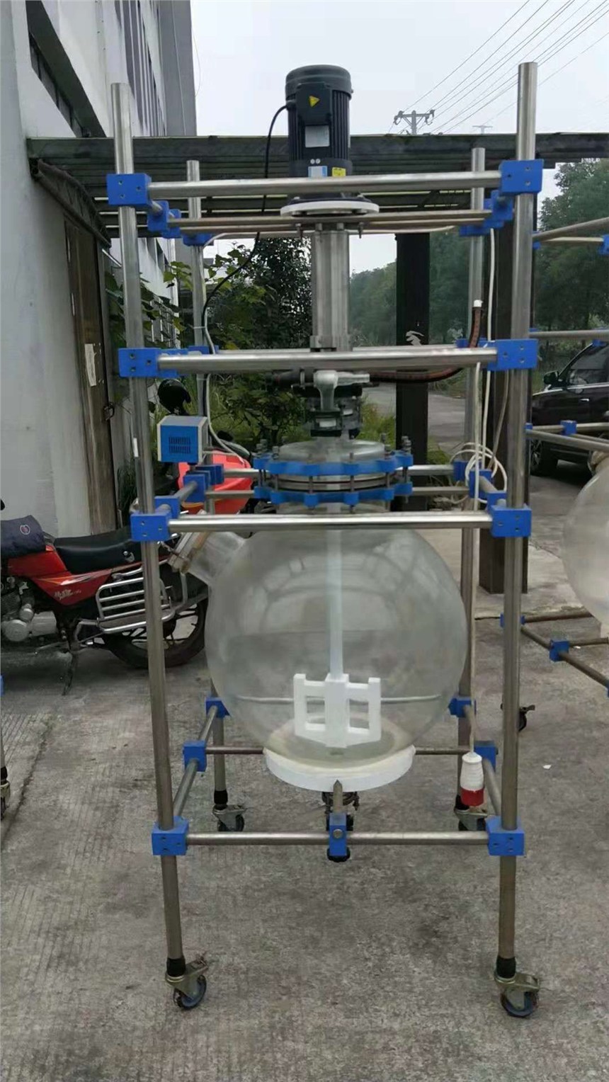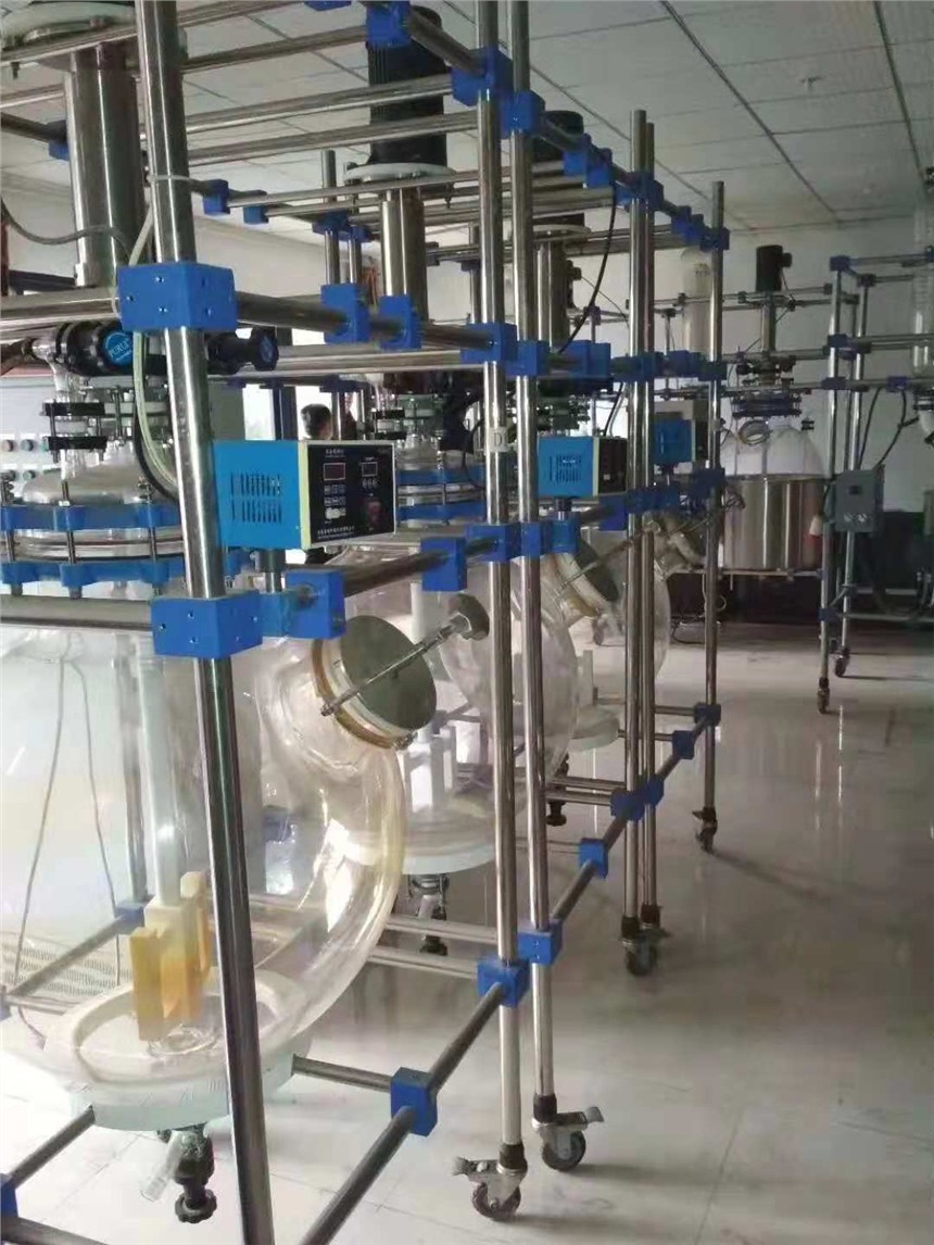 整体不锈钢立柱移动式框架结构,五口反应釜盖,具回流、加液、测温等全套玻璃。