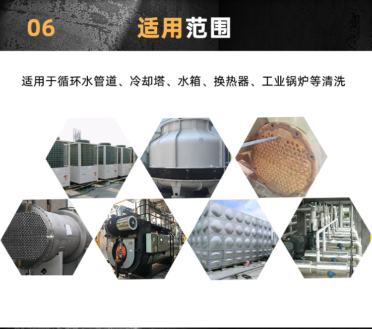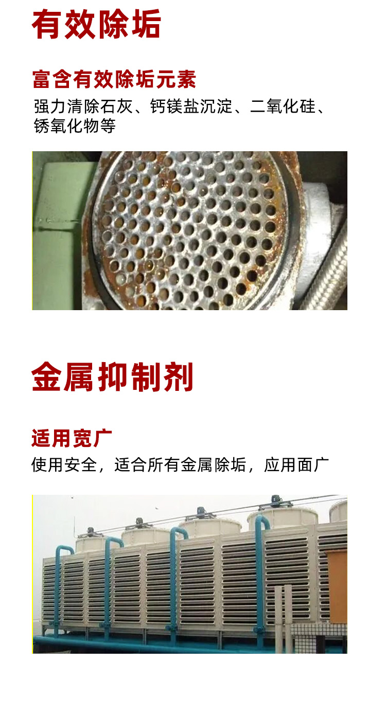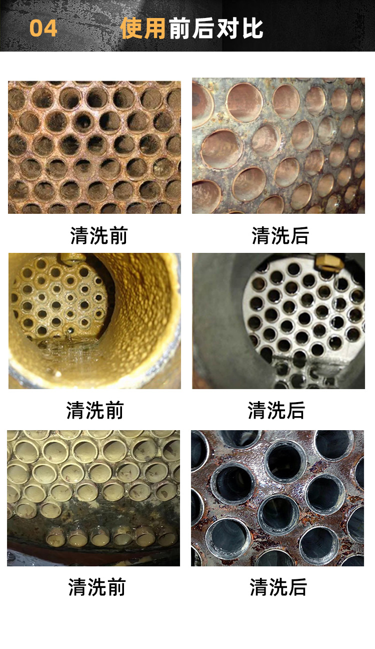 1.彩码颜色指示技术,方便判断清洗程度;2.富含有效除垢元素,强力清除石灰,钙镁盐沉淀.二氧化硅.锈氧化物等;3.足量金属抑制剂,使用安全,适合所有金属除垢,应用面广。