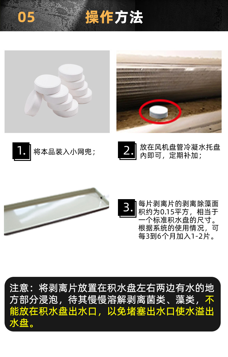 放入风机盘管冷凝水托盘內即可,定期补加。将杀菌片放置在积水盘左右两边有水的地方部分浸泡,让它慢慢溶解杀菌类与藻类,不能放在积水盘的岀水口,以免堵塞岀水口使水溢出水盘。