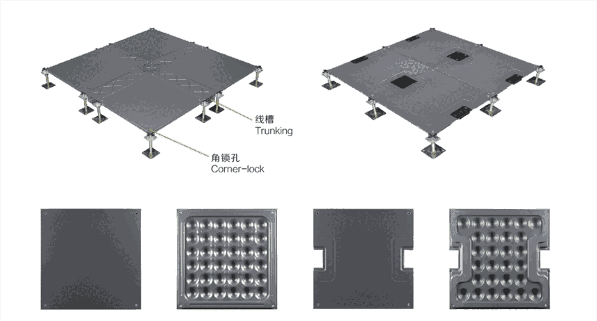 OA网络地板采用全钢结构,四角独立支撑结构,地板底面采用ST14拉伸版,表面选用SPCC硬质钢板,地板表面经过导电环氧树脂静电喷塑处理,内腔发泡水泥填充,四角冲角锁孔。支座采用镀锌或铸铝模压成型,丝杆高度可任意调节,地板四周成型有切边和包边两种,地板规格为500*500。