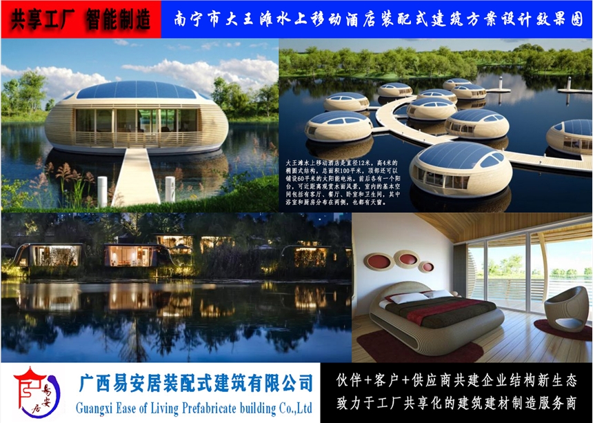 广西易安居装配式建筑有限公司研发制造的移动酒店、移动民宿、移动旅馆已实现工厂化、标准化、模块化、智能化设计制造。广泛地用于旅游景区、旅游城镇、移动露营客栈、移动乡村别墅、移动农场公寓还可以根据大型体育赛事、大型庆祝活动的自身特点和需求配备移动酒店;公司采用开放的空间及可利用的基础设施,利用装配式建筑特有建筑元素,诠释了移动酒店零排污全生态的空间概念公司系列产品设计新颖、简明美观,建设快,易维护,可循环使用,可量身定制,功能适用,拆装自由,运输方便,可随意变更地点,且模块单元自由组合,坚固耐用,密封性能,有很强抗震、抗变形特性。