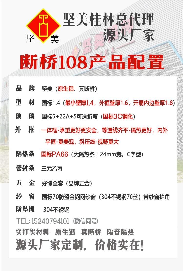 坚美铝材桂林总代理,桂林建丰节能门窗有限公司主营断桥铝门窗、推拉窗、阳光房、大厅/厨房推拉门、断桥/非断桥平开门、卫生间门、地弹门、栏杆、卫浴隔断、坚美铝材批发等各类铝型材产品,源头厂家定制,价格实在,承接家装、工装业务。我们是坚美铝材桂林总经销,原生铝好质量,实打实材料,承接工装,家装门窗业务,公司成立于2010年6月8日,厂址临桂,生产厂区位于桂林市临桂区会仙工业园内,公司自购工业用地 30多亩,新建生产车间有10000多平方米,办公楼和宿舍楼2500多平方米,在临桂吾悦广场附近还另设有2000多平的展厅,坚美品牌,实打实材料、国标型材,质量保证,量大价格从优,工装、家装、批发均可,源头厂家,厂址:临桂区世纪西路与三元路交汇处坚美铝材桂林总代理(吾悦广场附近)-坚美桂林总代理,有意者联系。