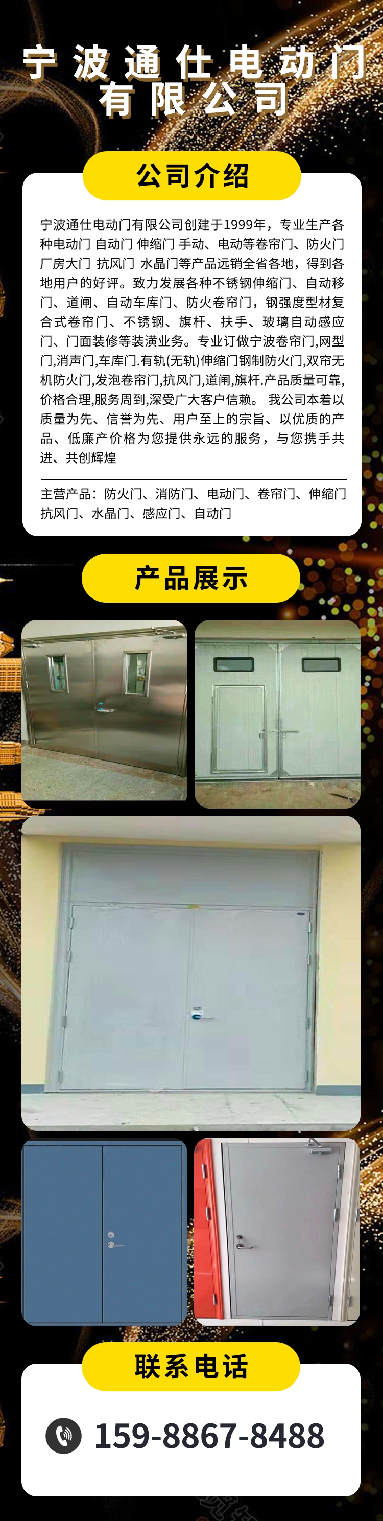 通仕门业是以生产 定制 销售 安装 维修与一体,主要产品:钢质防火门 木质防火门 防火卷帘门 不锈钢防火门 免漆防火门 防火窗 防爆门 电动门 电动卷帘门 厂房伸缩门 水晶门? 快速卷帘门 玻璃门 感应门 折叠门 自动门 道闸门 钢质门 配电房门 网型门 玻璃门 工业门 厂房大门 挡烟垂壁 卷闸门 抗风门 停车场收费系统 车辆识别系统? 钢结构楼梯 钢结构阁楼为主,集??研发、生产、销售、维修服务为一体的现代化企业,我们荟萃国内外防火卷帘门生产领域精英,引进设备,建立完善的管理体系.采用优质的原料,专业生产 订做 安装 维修各种卷帘门,电动卷帘门,防火卷帘门 钢质防火门 木质防火门 不锈钢防火门 防火窗 防爆门 电动伸缩门、玻璃感应门 智能收费系统、车牌识别系统、抗风门 水晶门 等安防产品,品种齐全。力求为每位顾客提供配套的产品,我们将始终以“质量可靠,科学管理”为理念,以“优越精品、诚信求恒”为宗旨。