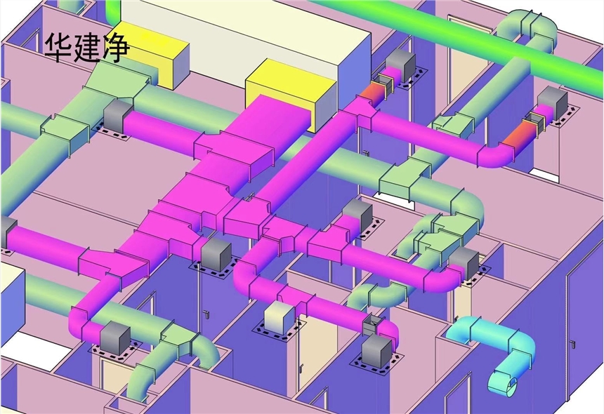 2、无尘车间通风净化系统工程,需要做无尘无菌处理的车间体积3000多立方,按洁净度十万级涉及需要15次的换气次数,则总风量需要到达4.5万M3/H的风量。楼层的高度限制造成送回风管道的吊装难度。设计师费尽脑汁加班研究一套合适的方案