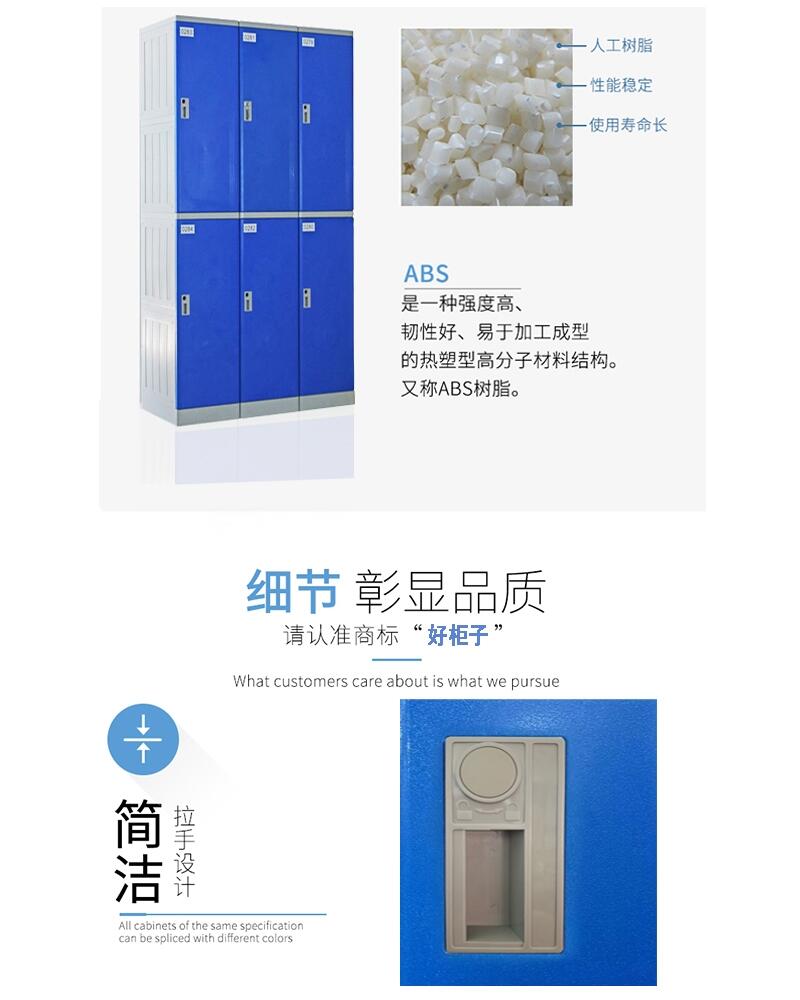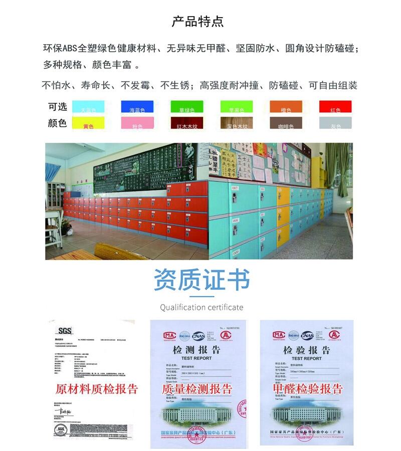 1、材 质:书包柜为ABS全新工程塑料制成,强度高、韧性好、耐冲击,不易腐蚀,无毒无味,环保耐用。