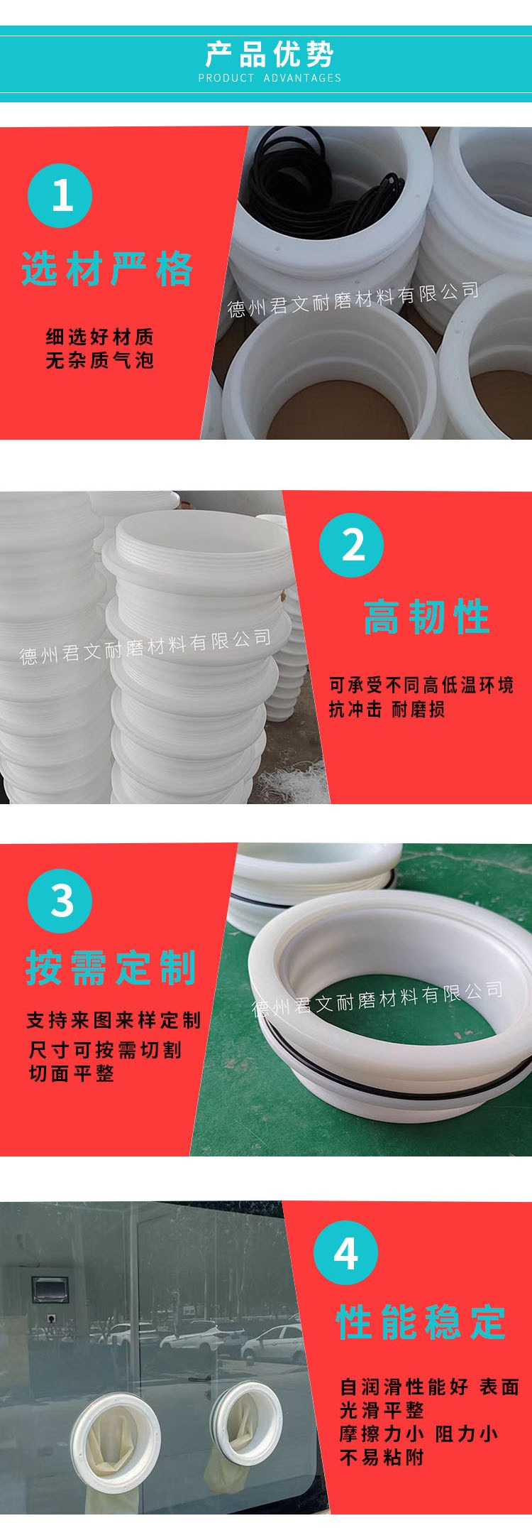 德州君文耐磨材料有限公司主要生产聚乙烯异形件,聚乙烯异形件是采用热塑性工程塑料PE颗粒,它综合了所有塑料的优越性能,具有耐磨损、耐冲击、耐化学腐蚀、自身润滑、抗低温磨损系数小、重量轻、吸能、耐老化、阻燃、抗静电等优良性能。
