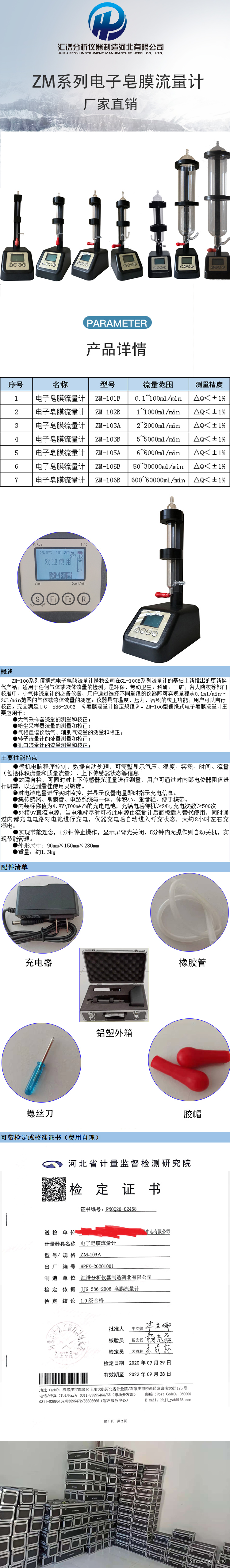 ZM-100B系列便携式电子皂膜流量计是汇谱分析仪器制造河北有限公司推出的更新换代产品,适用于任何气体或液体流量的检测,是环保、劳动卫生,科研,工矿,各大院校等部门校准中、小气体流量计的必备仪器。用户通过选择不同量程的仪器即可实现量程从0.1ml/min~50L/min范围的气体或液体流量的测定。仪器具有温度、压力、容积的校正功能,用户可以自行校正,完全满足JJG?586-2006?《皂膜流量计检定规程》。ZM-101B系列便携式电子皂膜流量计主要应用于: