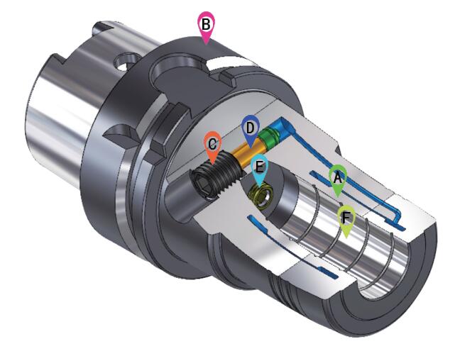 在油缸(D)的作用下,液压油向膨胀壁(A)均匀施压,膨胀壁对夹持部分做均匀对称的夹持,油腔内的液压油通过夹持壁均匀的将夹持力传递到刀具的夹持部位,由于中间油脂柔性的压力,降低了刀具切削的震动,减少了对刀具边缘的磨损,可延长刀具40%的使用寿命,使加工零件的尺寸更加稳定,也能有效的保护机床主轴的精度和使用寿命。