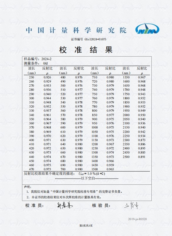 合格证 说明书 《中国计量院检测的漫反射比数据复印件》 |