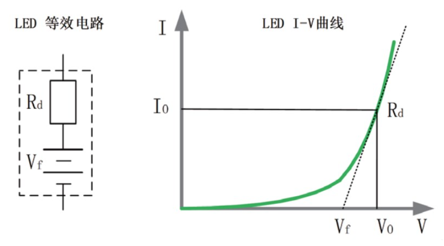 LED电源是恒流源,其输出电压有一段可调范围且大于LED的导通电压,输出电流稳定,不能大于LED额定电流,否则会加速LED衰老损坏。由LED等效电路可知,LED等效为电阻Rd与电压源Vf的串联,其I-V曲线等效于真实LED非线性I-V曲线在工作点(Vo,Io)处的切线,常规的电子负载采用CR或者CV模式并不适合LED电源的测试需求。