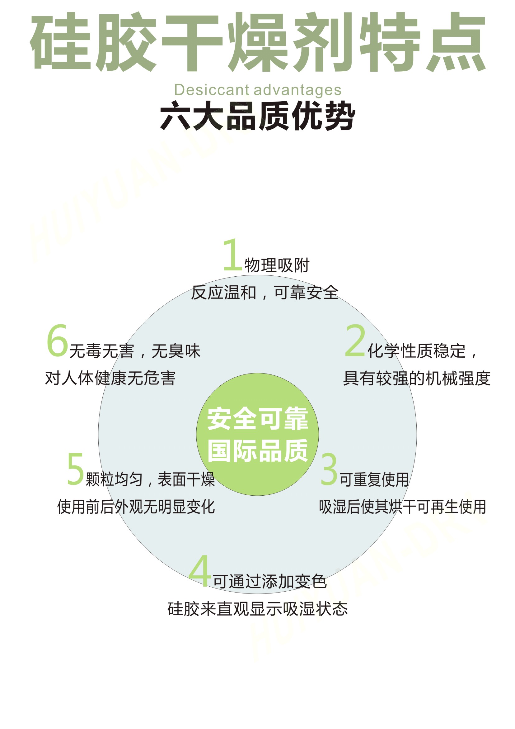 无毒、无害、无污染:硅胶干燥剂经过严格的质量控制和认证,符合中国化学标准HG/T2765-2005以及FDA的认可标准。它是唯一被FDA认可可直接与食品药品接触的干燥剂,无毒、无味、无腐蚀,不会对食品产生任何污染。