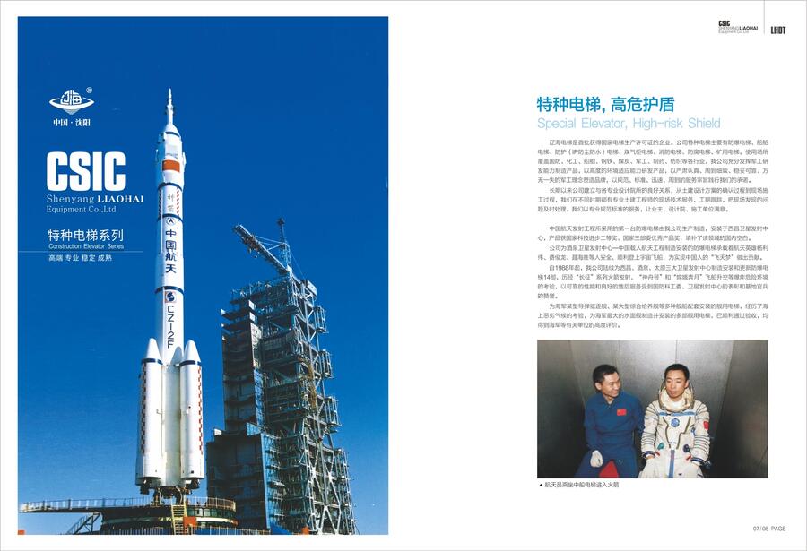 引进国内外先进技术,先后开发研制了防爆电梯、防爆吊笼、船用电梯、防腐电梯、乘客电梯、住宅电梯、观光电梯、无机房电梯、医用电梯、载货电梯等电梯产品。其中特殊环境专用特种电梯广泛应用于航天、石油、化工、、煤气及舰船等特殊场所和环境中。本厂为西昌、太原、酒泉三个卫星发射中心生产并安装的防爆电梯,经过“神州5号”、“神州6号” “神州7号” “神州10号”飞船升空及卫星发射现场爆炸危险环境的严峻考验,以其防爆性能可靠、运行平稳、故障率低和良好的售后受到中央军委、国防科工委的表彰和基地官兵的广泛赞誉。安装于海军出访美国给养舰中的船用电梯经历了海上恶劣气候的考验,运行良好,结束了船用电梯依赖进口的历史。