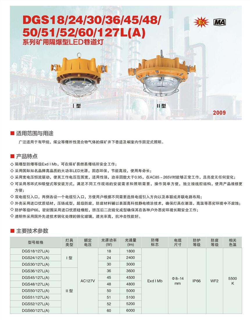 适用于有甲烷、煤尘等爆炸性混合物气体的煤矿井下巷道及硐室内做固定式照明。