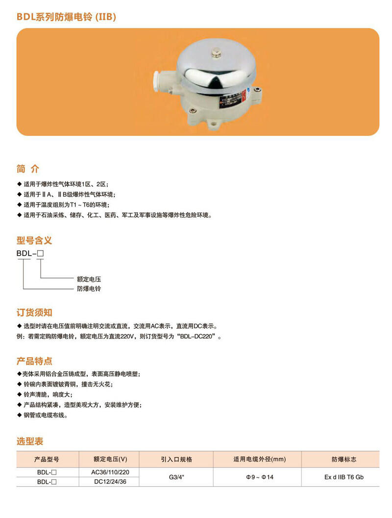 例:若需定购防爆电铃,额定电压为直流220V,则订货型号为“BDL-DC220”