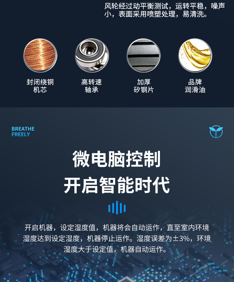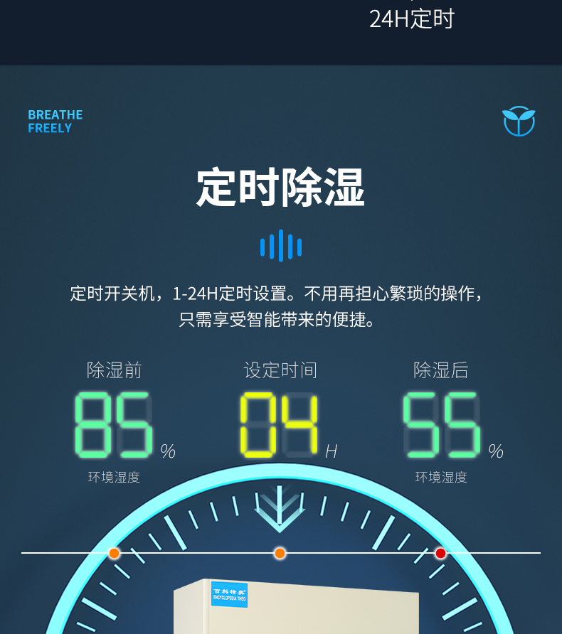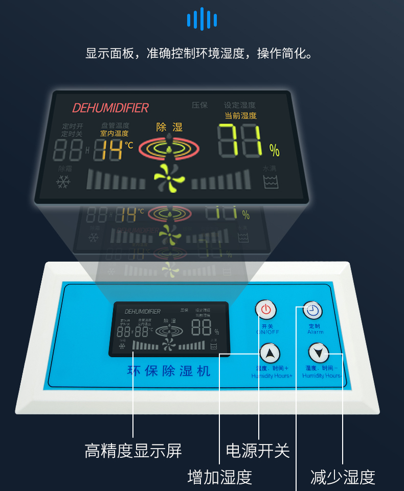 本产品属冷冻式除湿机,整机有压缩机、热交换器、风扇、机壳及控制器组成,其工作原理是:由风扇将潮湿空气抽入机内,经过制冷系统(压缩机,蒸发器,冷凝器)相互作用下凝结成霜,系统自动升温化霜成水流入盛水箱,产生出干燥空气排出,如此循环使室内湿度降低,潮湿空间逐步达到干爽的效果。