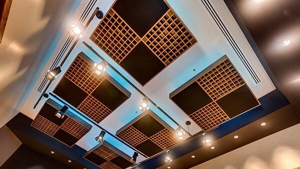 为了保持演播室的室内录音的丰满度和饱和度,同时在墙体上做有一些硬木的反射体,四周的阴角部分均有一些声学扩散处理,为了避免声学缺陷,在声音的对面使用一些吸声扩散体来满足室内声学效果。