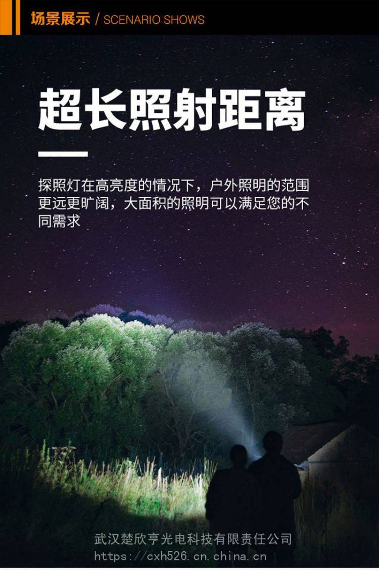 选用4只3W大功率正白光LED光源串联使用,光效极高、耗能极少、寿命长达10万h、冷色光、反光杯采用高科技表面处理工艺,反光效率高,光斑光色均匀,灯具照射距离可达1500米以上。
