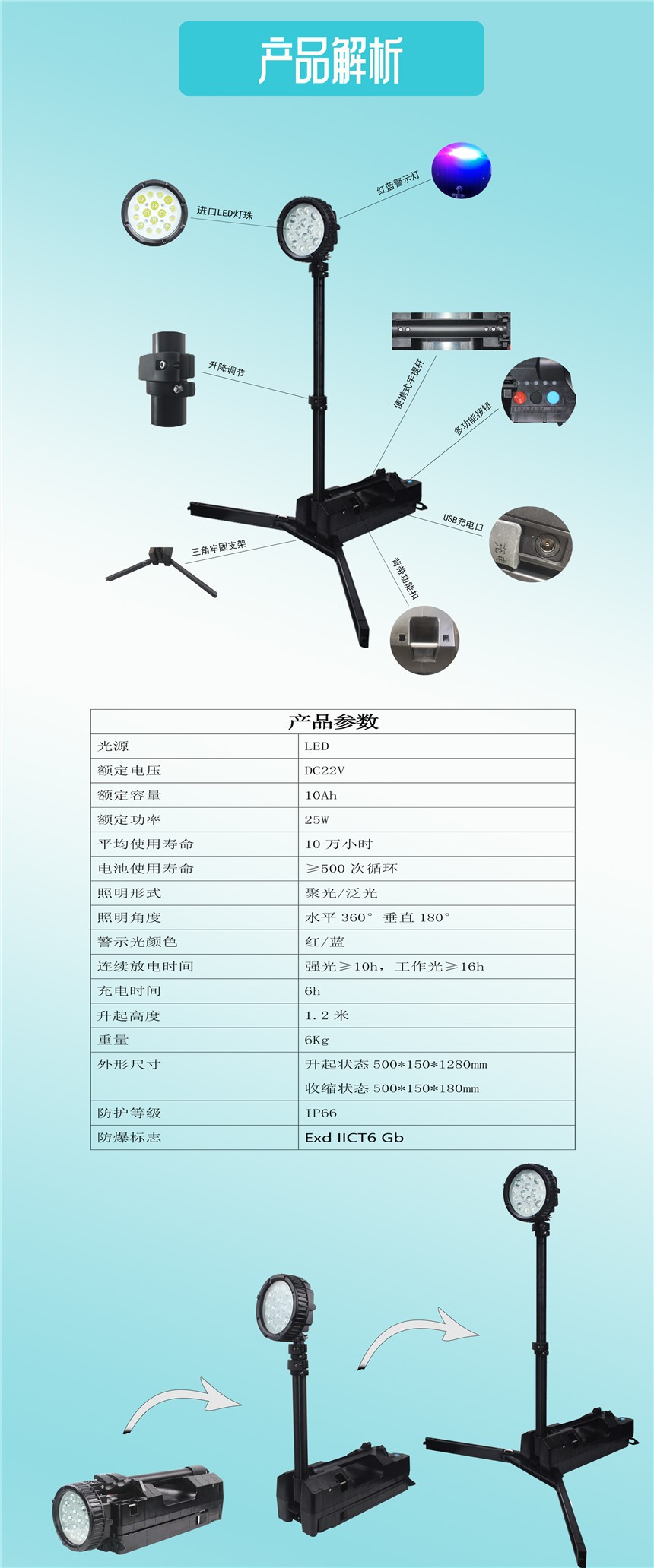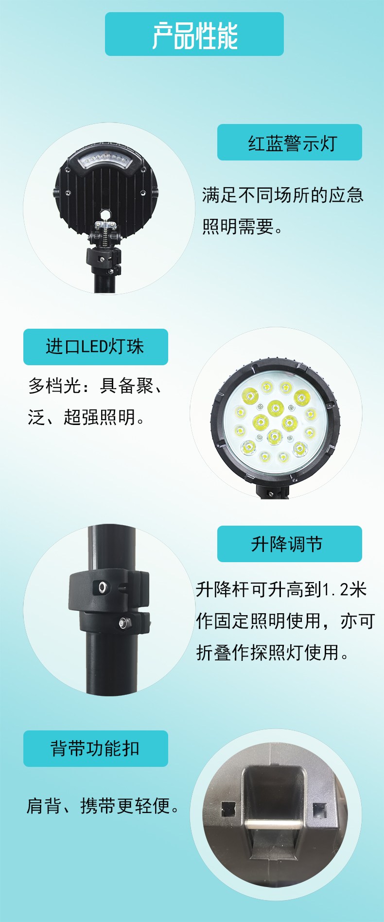 3. 多功能,升降杆可升高到1.2米作固定照明使用,亦可折叠作探照灯使用。