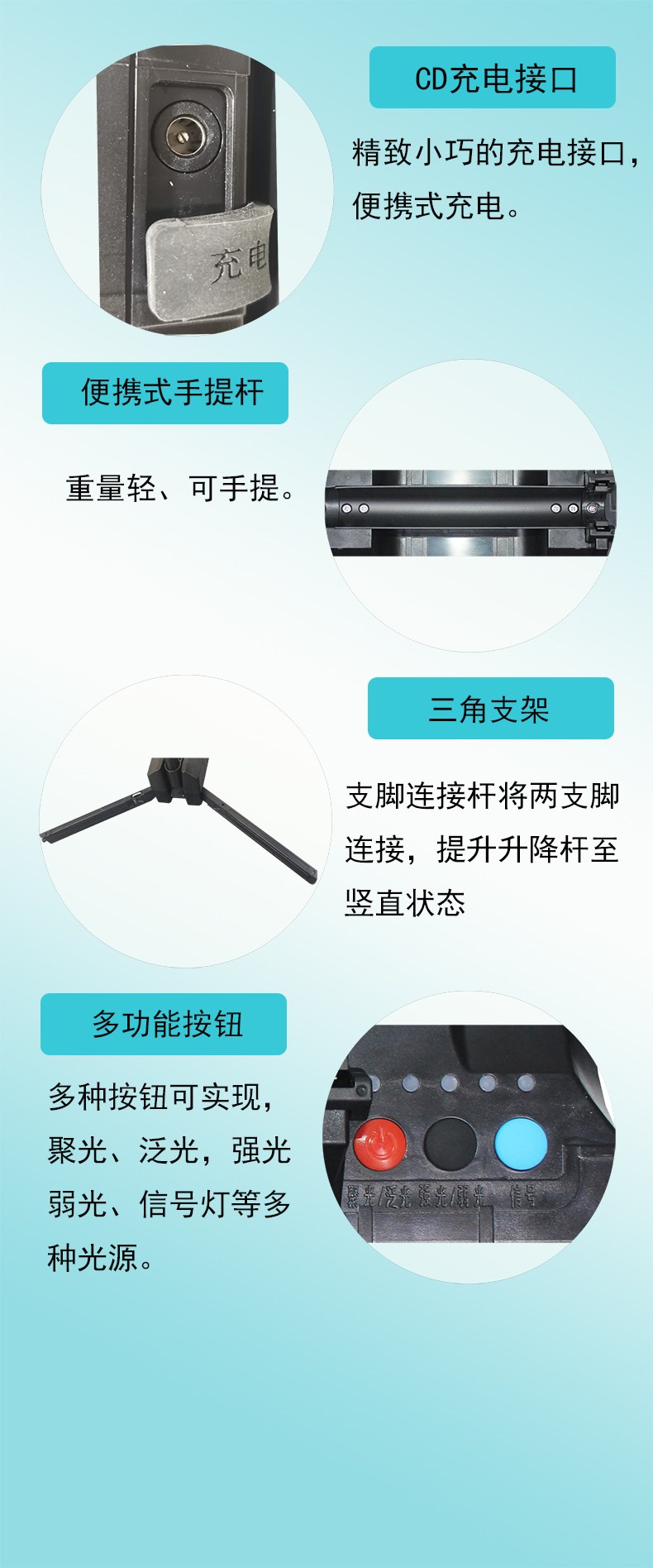 5.多档光,具备聚、泛、超强照明,以及红黄警示灯,满足不同场所的照明需要。