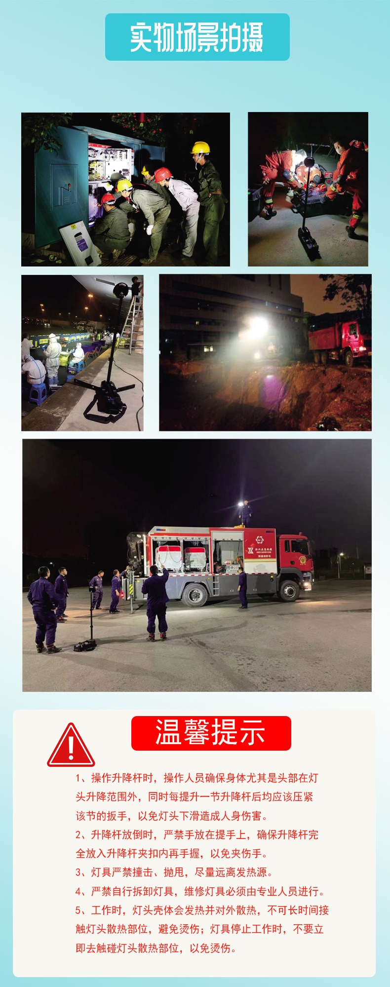 4.长时间,强光放电时间>10h,工作光放电时间>16h,满足夜间长时间施工照明。