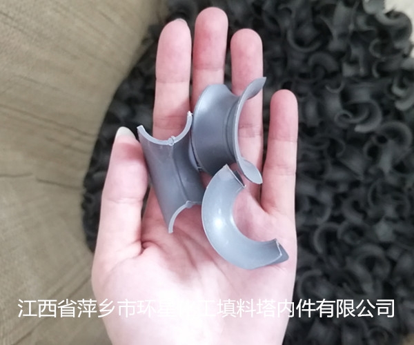 塑料散堆填料矩鞍环填料类似于鞍形状,兼有两者之优点这种填料层中主要为弧形的液体通道,填料层内的空隙较环形填料更加连续,使气体沿弧形边通道流动,这种结构有利于液体分部和增加了气体通道。它采用连续挤出的工艺进行加工,与同种材质的拉西环填料相比,具有通量大、压降低、效率高等优点。比鲍尔环阻力小、通量大、效率高、填料强度和刚性较好,是目前应用zui广的一种散堆填料。