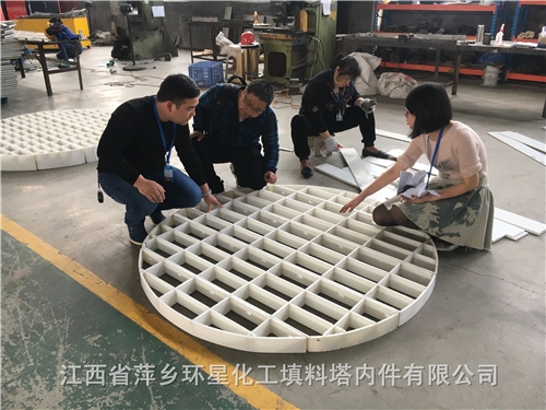 塑料格栅是由塑料板、棒管,经加工后经过塔径,人孔的大小进行组装而成,设计,制造更简单,并提高了塔的利用空间。它是以塑料板片作为主要传质构件,塑料板片垂直于塔截面,与气流和液流方向平行,上下两层呈45°旋转,塔内气流和液流逆旋转,旋流流动接触。液体靠重力沿格栅表面下降,与上升的气体接触,在塑料板片表面呈膜状接触,因此传质效果好,吸收效率高。