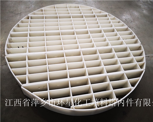 由于塑料格栅板片间距离较大,板片表面十分光滑,气体上升和液体下降阻力大大的降低,气体和液体有固定的通道,流体在板片间不断地冲刷接触,使得含尘气体和液体不会再填料表面停滞、沉积、淤堵和堵塞。因此塑料格栅填料是一种高效、大通量、低压降、不会堵塔的新型规整填料,在正常操作条件下,通量比板式塔高80%。塑料格栅也可作为格栅支撑用,安装在填料层底部,作用1、阻止填料穿达填料支撑而掉下来。2、支撑操作状态下填料床层的重量 。3、具有足够的自由面积已使气液两相自由通过。格栅间的间隙可根据客户要求制造。