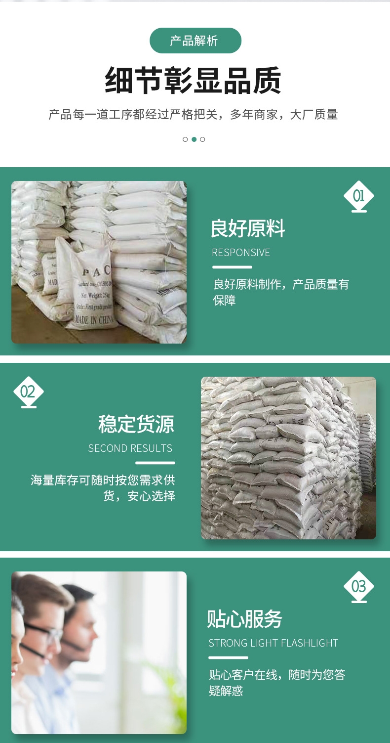 聚合氯化铝PAC。通常也称作净水剂或混凝剂,颜色呈黄色或淡黄色、深褐色、深灰色树脂状固体。该产品有较强的架桥吸附性能,在水解过程中,伴随发生凝聚,吸附和沉淀等物理化学过程。聚合氯化铝与传统无机混凝剂的根本区别在于传统无机混凝剂为低分子结晶盐,而聚合氯化铝的结构由形态多变的多元羧基络合物组成,絮凝沉淀速度快,适用pH值范围宽,能有效支除水中色质SS、COD、BOD及砷、汞等重金属离子,该产品广泛用于饮用水、工业用水和污水处理领域。