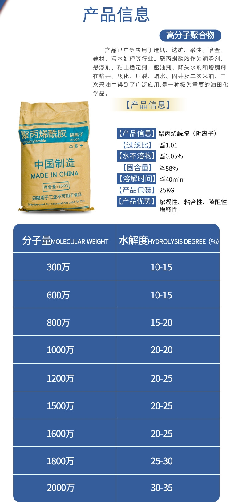 ? ? ? ?聚丙烯酰胺(PAM)是一种线型高分子聚合物,化学式为(C3H5NO)n。在常温下为坚硬的玻璃态固体,产品有胶液、胶乳和白色粉粒、半透明珠粒和薄片等。热稳定性良好。能以任意比例溶于水,水溶液为均匀透明的液体。长期存放后会因聚合物缓慢的降解而使溶液粘度下降,特别是在贮运条件较差时更为明显。聚丙烯酰胺作为润滑剂、悬浮剂、粘土稳定剂、驱油剂、降失水剂和增稠剂,在钻井、酸化、压裂、堵水、固井及二次采油、三次采油中得到了广泛应用,是一种极为重要的油田化学品。