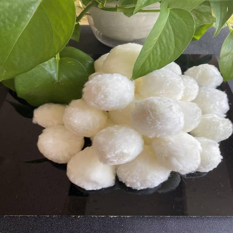 纤维球滤料是由纤维扎结而成的球形滤料,它与传统的钢性滤料相比,具有弹性效果好,不上浮水面,空隙大,工作周期长,水头损失小等优点。在过滤过程中,滤层空隙沿水流方向逐渐变小,比较符合理想滤料由上大下小的孔隙率分布,从而形成了滤速快,截污容量大,过滤效果好,可再生反复使用,不必全部更换,省时省力等优点。