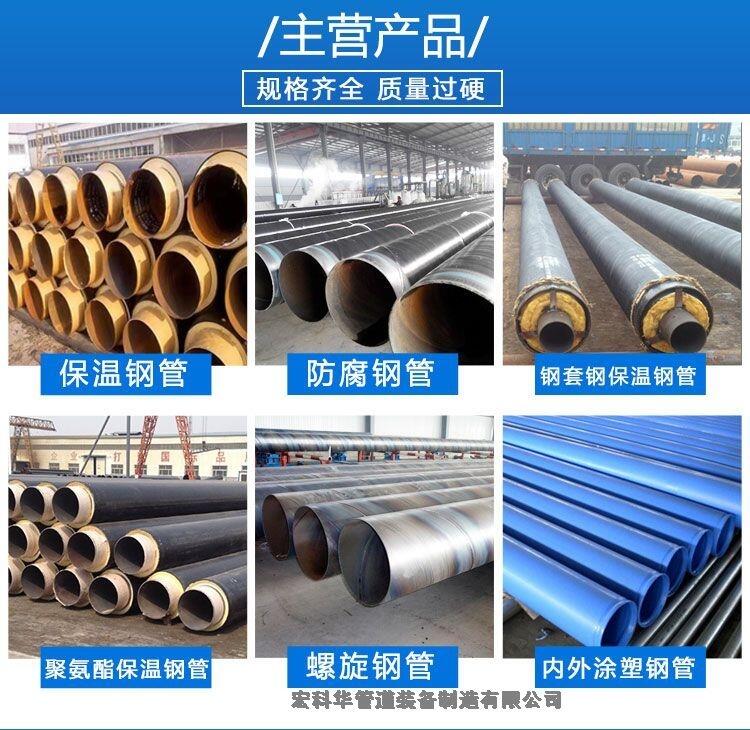 ??? 宏科华管道装备制造有限公司以优良的螺旋钢管,直缝钢管,无缝钢管为基材、专业生产加工销售:保温钢管,聚氨酯保温钢管,钢套钢保温钢管,3pe防腐钢管,TPEP防腐钢管,涂塑钢管,石油套管,环氧煤沥青防腐钢管,环氧树脂保温钢管,环氧粉末防腐钢管,8710防腐钢管,ipn8710防腐钢管,水泥砂浆防腐钢管,3pp防腐钢管(普通/加强/特加强级)、聚氨酯保温钢管、钢套钢保温钢管等各种防腐保温钢管;在我国广泛应用于供暖,取暖,输水、石油、化工、天然气、热力、污水处理、水源、桥梁、钢结构,海洋输水打桩等管道工程领域。