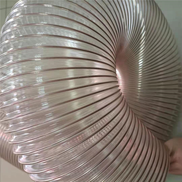 pu钢丝吸尘软管,工业吸尘软管采用镀铜钢丝完整的包覆于管壁,能较好的满足各行各业的输送要求,是以坚固弹性镀铜钢丝包覆于管壁;管壁:优质聚酯型-聚氨酯,具有高扩张强度及撕裂强度,耐磨损(较大多数橡胶材料高2.5~5倍,较软性PVC高3~4倍),良好的耐矿物油,良好的抗化学、抗紫外线及臭氧性能。如何选择合适的工业吸尘软管?在选择的时候可以根本常规行业选择,比如木工吸尘软管选择0.4mm或0.6mm厚的管,钻孔机吸尘管选择0.9mm厚的管,印刷机通风软管选择1.5mm厚的管,扫地车吸尘管选择2.0mm厚的管等,如果不是常规行业,可以根据输送的介质来选择,一些细微的粉末或是压力小的环境用管壁较薄的,一些压力大或是粗的颗粒输送选择较厚的。