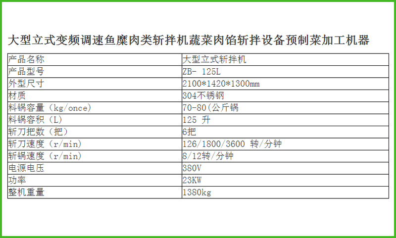 ZB-125L斩拌机利用斩刀高速旋转的斩切作用,将肉块、蔬菜等主要原料精细的斩切成肉馅或肉泥等糜状,同时将其它辅料一起搅拌均匀。机器刀速、锅速、斩刀与斩锅的间隙达到合理的组合,能确保肉制品的斩切细度,发热小,斩切时间短,很大程度的提高了肉制品的乳化效果,提高产品的弹性、出品率和保质期.是预制加工产业中心、酒店、食堂、肉食加工厂等单位所理想的肉类加工机械。