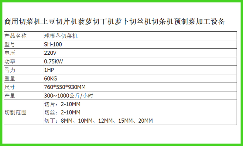 切割范围 | 切片:2-10MM 切丝:2-10MM 切丁:8MM、10MM、12MM、15MM、20MM | ||