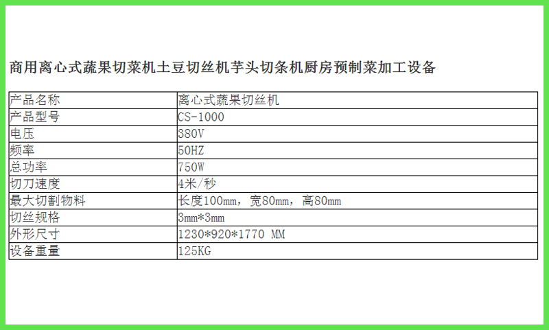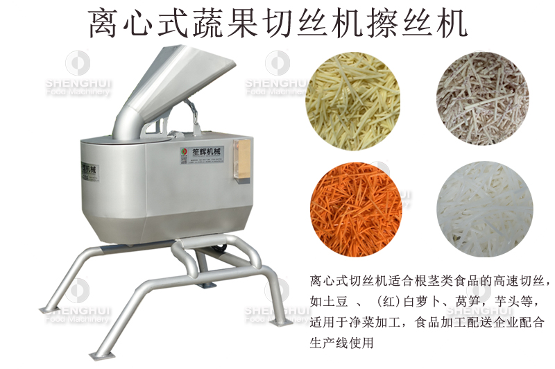 CS-1000离心式擦丝机适合根茎类食品的高速切丝,如土豆 、 (红)白萝卜、莴笋等,适用于净菜加工,食品加工配送企业配合生产线使用!设备不锈钢材质 ,304型不锈钢外壳和框架,表面喷砂处理。具有成型速度快、废料少、切割均匀等特点。加大入料斗梯形设计,配备开盖即停开关;内部采用二维离心切割设计,复合刀组可根据不同物料切割尺寸需求,定制不同刀组。