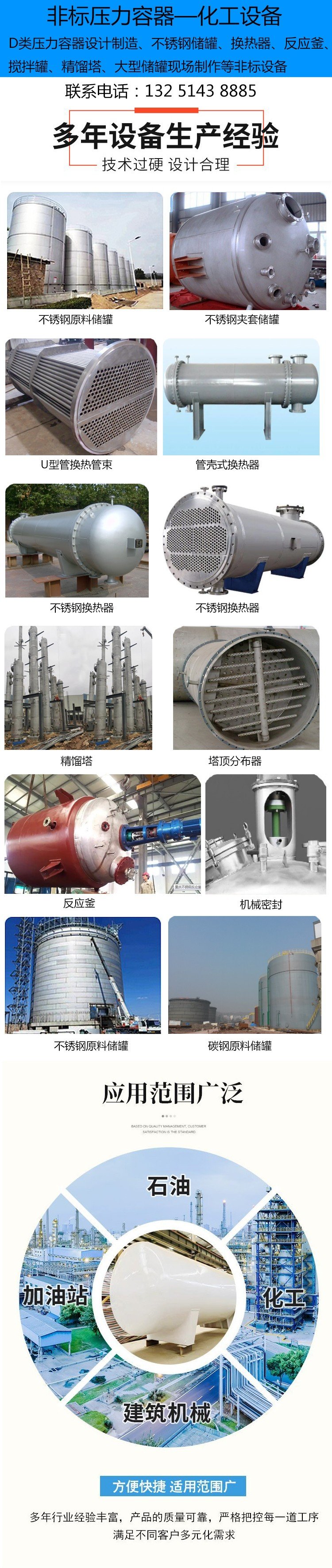 公司专业从事D类压力容器、不锈钢储罐、换热器、反应釜等化工设备的设计、研发、制造、销售;产品覆盖了天然气化工、煤化工、医药化工、精细化工、食品等行业。公司追求高质量、高效率、高性价比的方针,秉承:“诚信、务实、创新”的企业理念,致力于为客户提供满意的产品及服务,推动企业从优秀走向卓越。