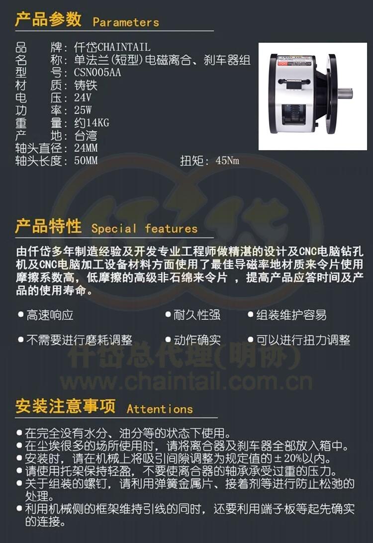 5KG电磁离合刹车器台湾仟岱双法兰离合制动器CSN005AA仟岱总代理选型安装指导。
