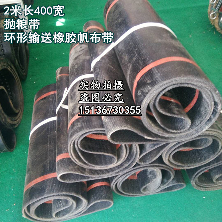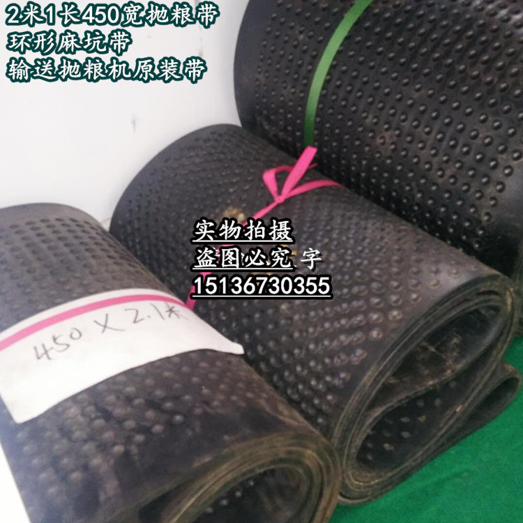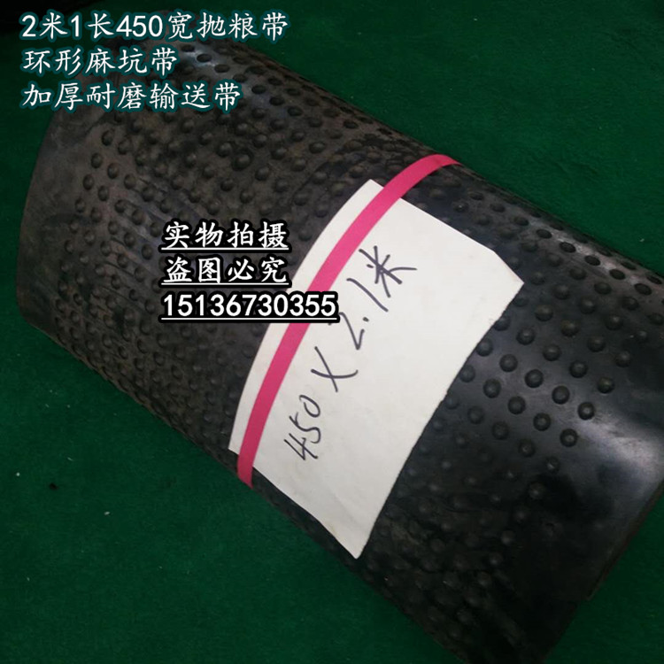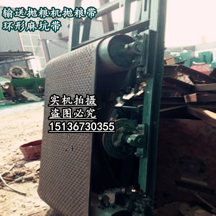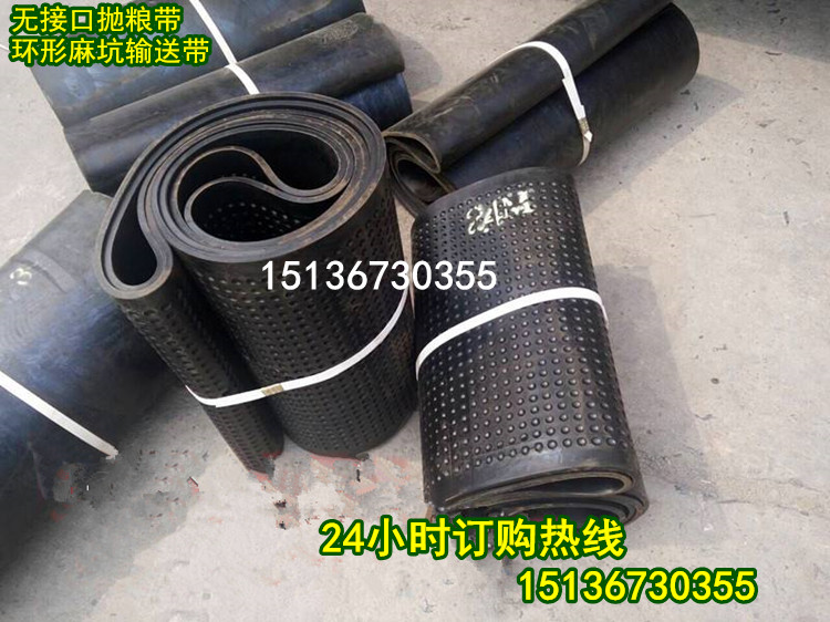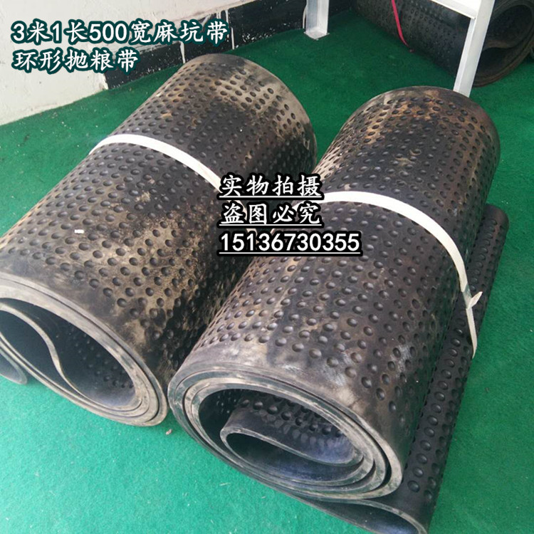 麻坑环形抛粮带 扬场机抛粮机皮带 500宽输送带是扬场机抛粮机专用的加厚耐磨无缝无接口的麻坑皮带,抛粮带又称运输带,含高强力尼龙 覆盖层:拉伸强度不小于15Mpa,扯断伸长 胶带度不小于350%,磨耗量≤200mm3,层间粘合强度纵向试样平均值布层间不小于3.2N/mm,覆盖胶与布层间不小于2.1 N/mm全厚度纵向扯断伸长率不小于10%,全厚度纵向参考力伸长率不大于1.5%