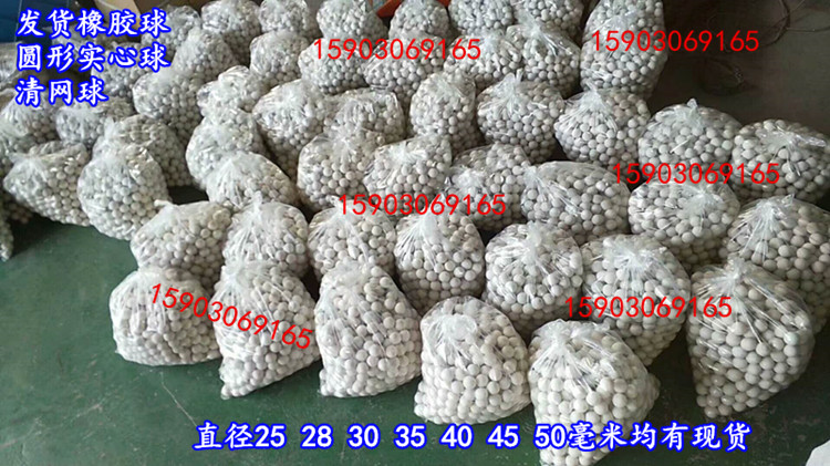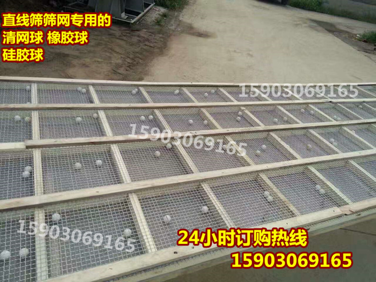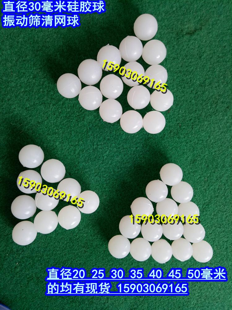 振动筛直线筛常用的防堵网球 白色实心圆形硅胶橡胶球 橡胶球:又称弹跳球。振动筛弹跳球是振动筛不可缺少的部分,它是在振动筛工作的时候受冲孔板的作用力不停地上下跳动,往复地敲击筛网,从而实现清理筛网提高透网率的目的。它的材质一般为天然橡胶、硅胶和氟胶等,天然橡胶弹跳球适用于一般物料筛分过程;硅胶弹跳球具有弹性好耐磨不易脱落等优点,主要适用于食品、医药等物料筛分;氟胶密封皮具有耐油性,在油中浸泡不会变形等特点,主要适用于含油性液体物料筛分。