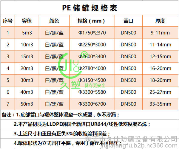 久塑牌新型加强型pe药剂储罐具备独特的外形,不同于其他常规储罐,适合存放稀硫酸、任何浓度盐酸、任何浓度次氯酸钠、液碱、漂白水、氢氧化钠、三氯化铁、酸碱盐溶液、电镀废水、工业废水、污水、纯水、聚羧酸减水剂、外加剂等一系列危险化学品,pe储罐使用韩国进口的原料lldpe为加强型,性能耐酸耐碱,不易老化,是环保、水处理、危废处理、化工、食品、酿造、印染、建材、石英砂行业的**选择。主要产品有塑料储罐、pe水箱、pe储罐、盐酸储罐、漂白水储罐、次氯酸钠储罐、液碱储罐、氢氧化钠储罐、双氧水储罐、三氯化铁储罐、稀硫酸储罐、减水剂储罐、外加剂储罐、污水储罐、原水储罐、废水储罐、纯水储罐等等。具体介质及产品请来电咨询。